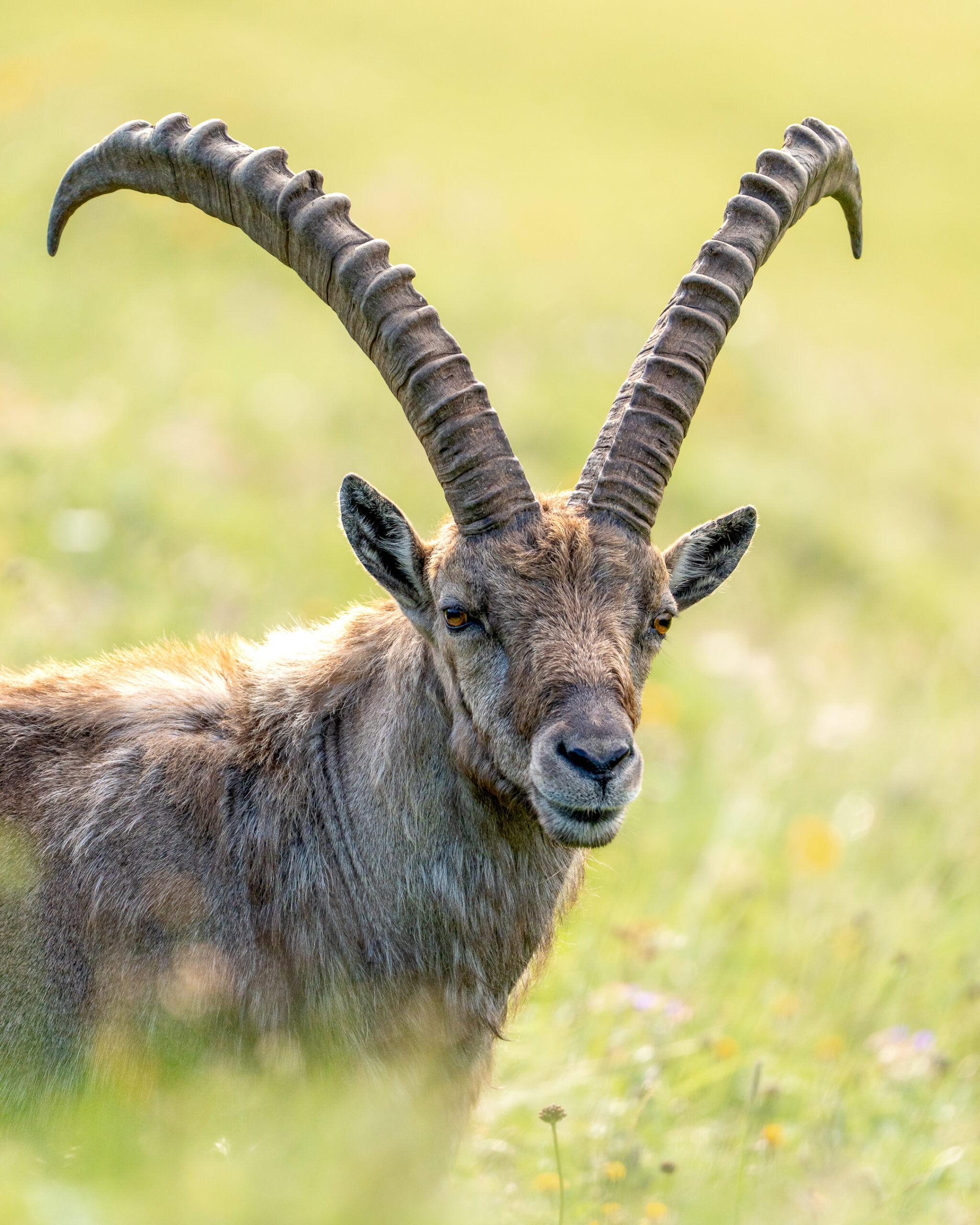 Mein Ziel an diesem Morgen ist es, möglichst viele Blickwinkel auszuprobieren, um eine grosse Vielfalt an verschiedenen Bildideen umzusetzen. Die Lichtverhältnisse sind dafür beinahe perfekt – zumindest, solange die Sonne nicht hinter einer dicken Wolke verborgen bleibt. Als sie schliesslich durch eine dünne Schleierwolke scheint, wird das Licht diffus. Dadurch werden die Strukturen und Farben der Steinböcke wunderbar weichgezeichnet, und schöne Details kommen zur Geltung.