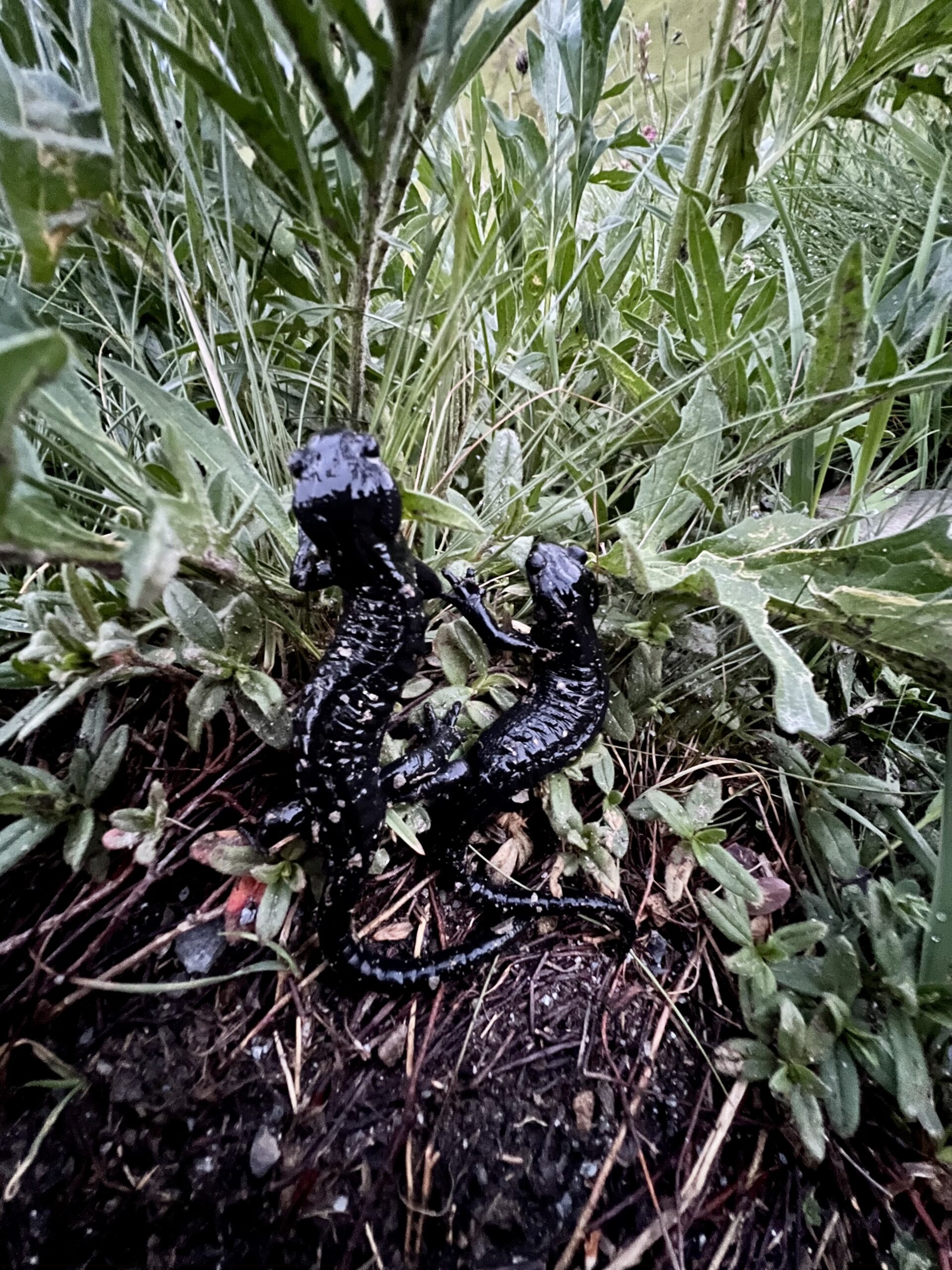 Bald erreiche ich die Waldgrenze. Es geht über Alpenwiesen immer weiter den Berg hinauf. Auf dem Wanderweg begegne ich zahlreichen Alpensalamandern. Erstaunlich, wie viele ich an diesem Morgen entdecken kann. Bei jedem Schritt muss ich aufpassen, keinen zu zertreten. Einige Salamander kann ich sogar bei der Paarung beobachten. Die Feuchtigkeit des Regenschauers vom Vortag scheint ihnen gutgetan zu haben.