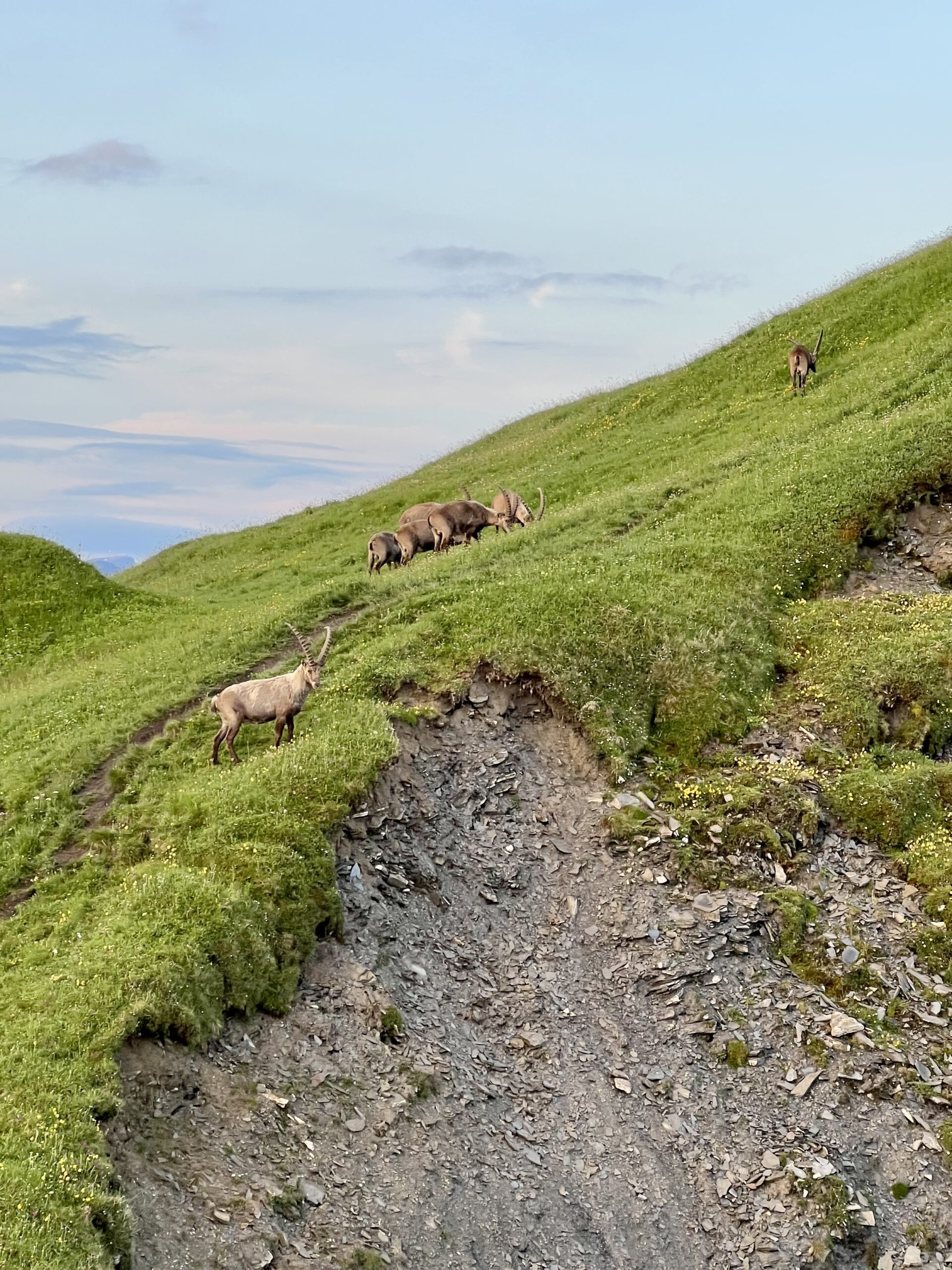 Langsam nähere ich mich den Tieren. Auf dem Weg höre ich den Ruf von Alpenschneehühnern – ein schöner Moment, auch wenn ich sie in der Morgendämmerung nicht entdecken kann.