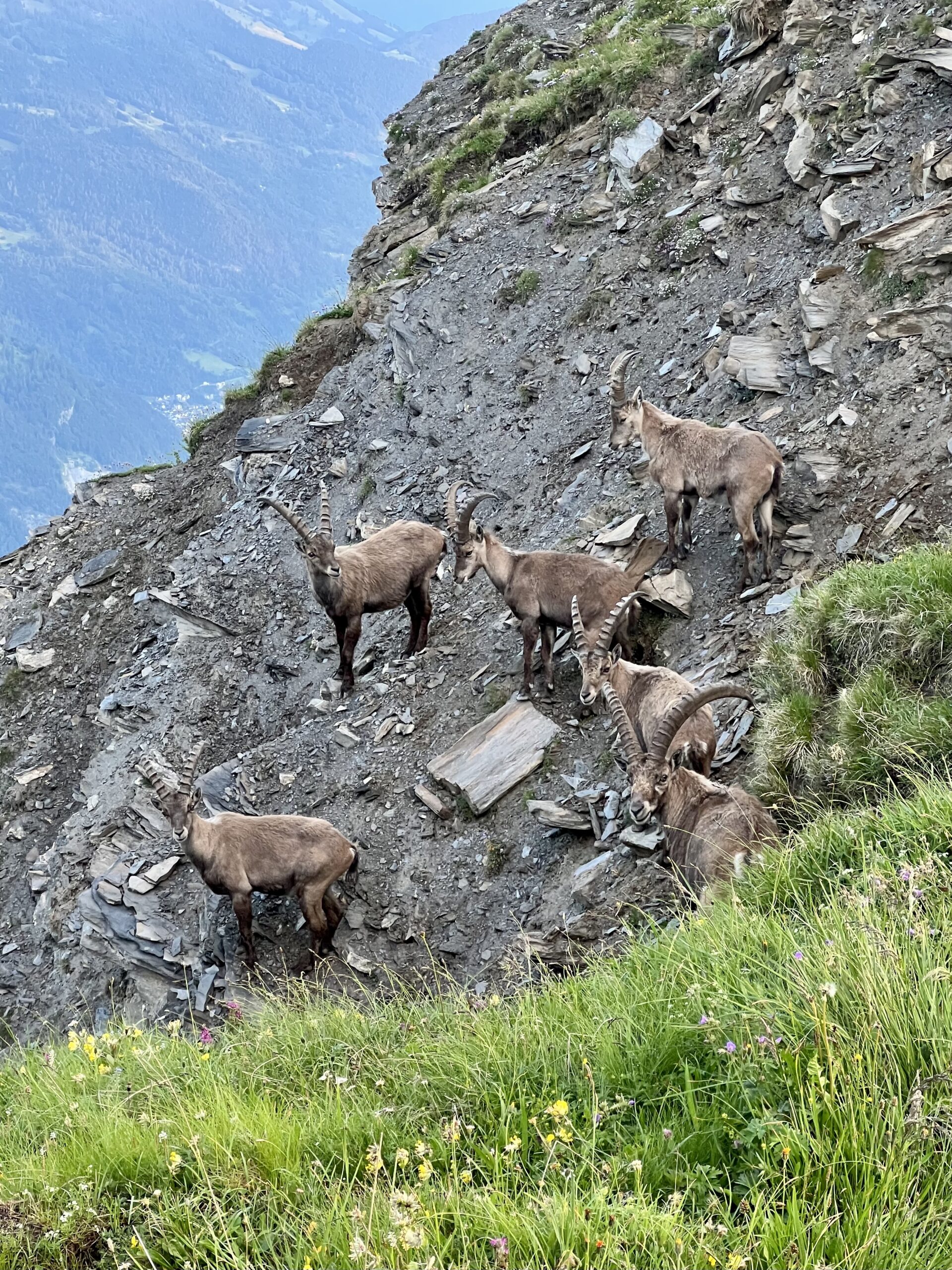 Schliesslich erreiche ich einen geeigneten Ort, um die Steinböcke aus sicherer Entfernung zu beobachten. Sie haben mich bereits bemerkt. Jetzt gilt es, ihnen mit Respekt zu begegnen und nicht auf sie zuzulaufen, damit sie nicht flüchten. Obwohl Steinböcke meist gelassen auf Menschen reagieren, warte ich geduldig, bis sie sich an meine Anwesenheit gewöhnt haben.