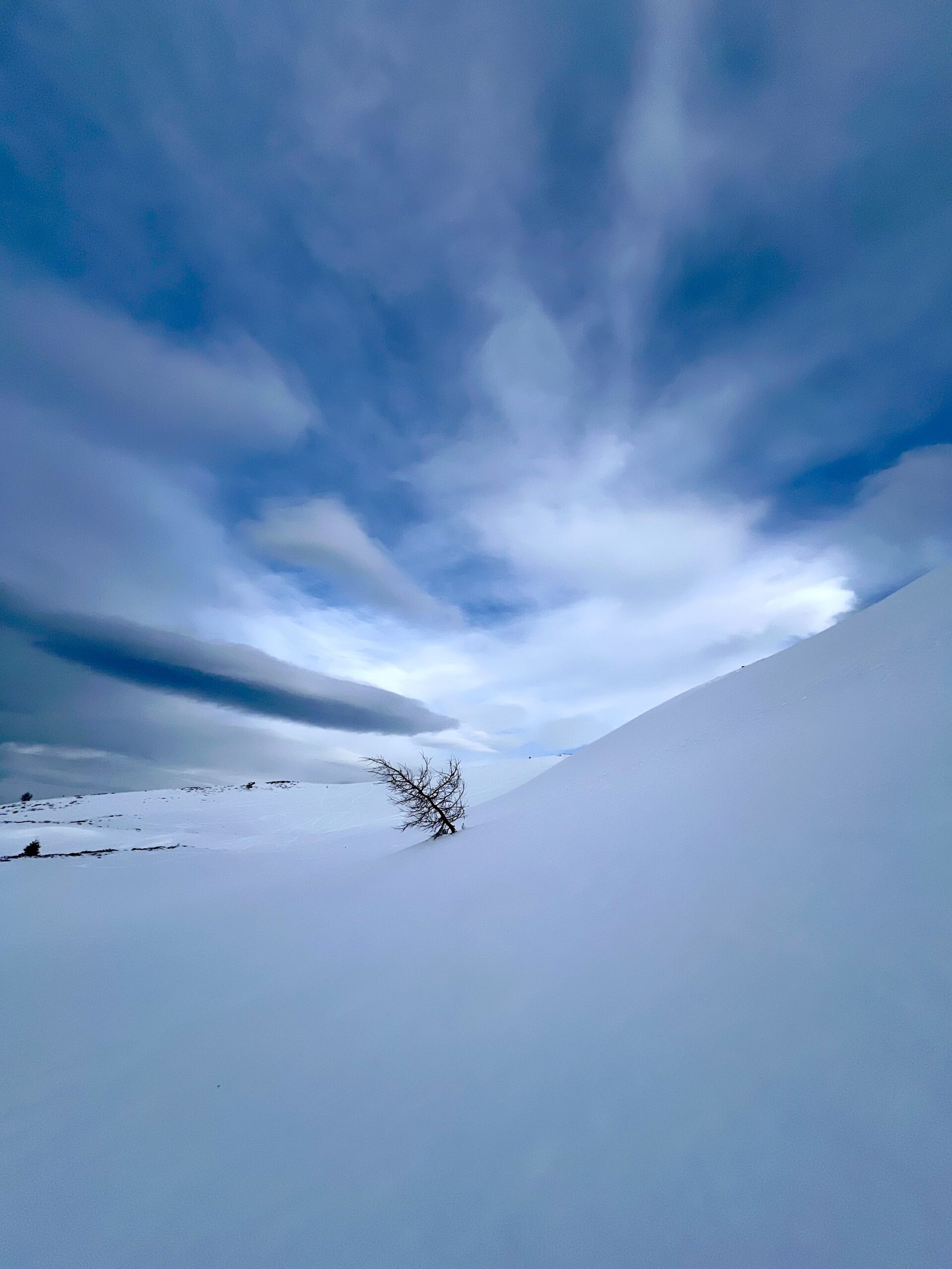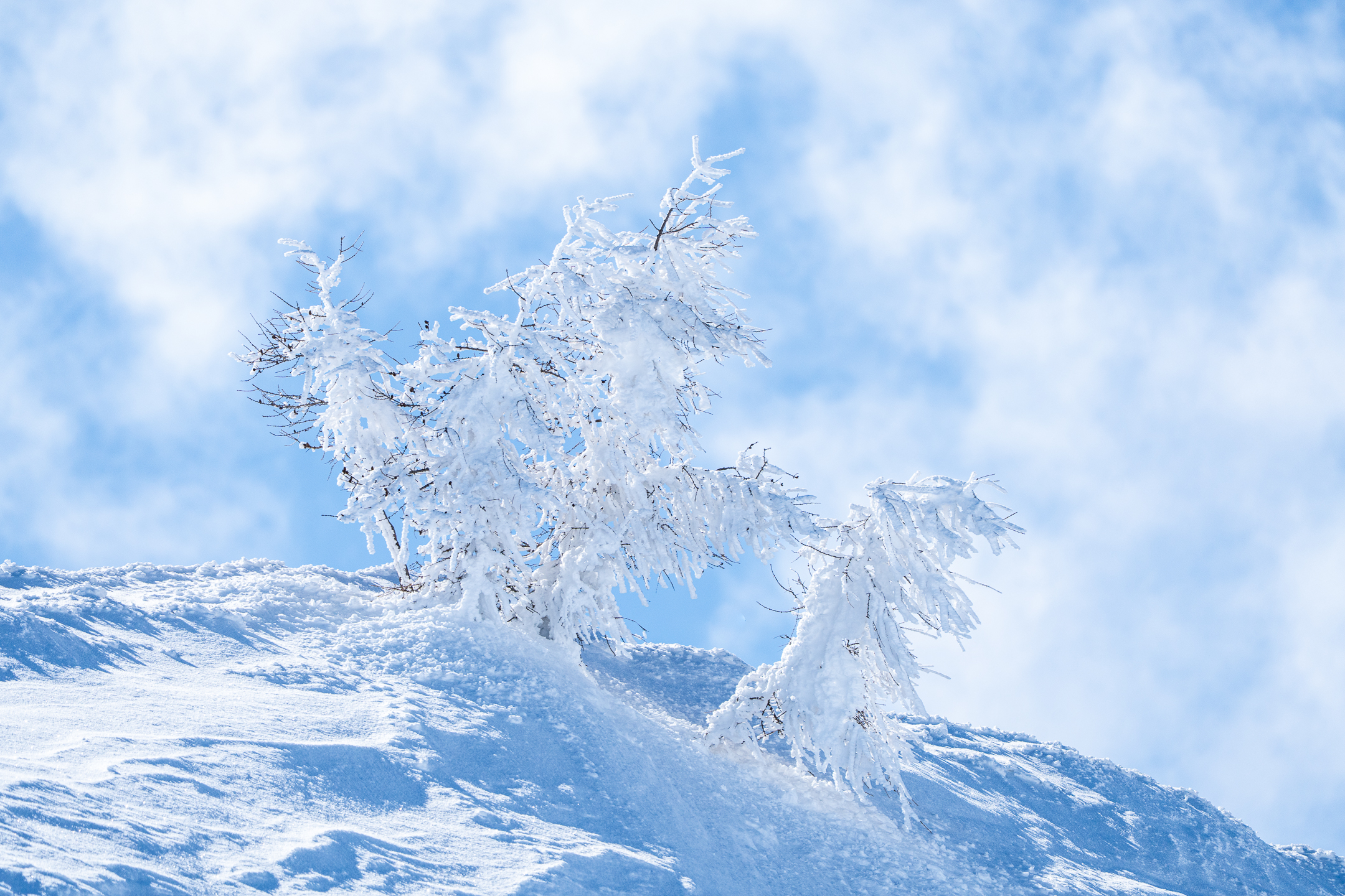 verschneite Lärche mit Schleierwolken im Hintergrund // 1/3200 sec | f/6.3 | ISO 500 | 455 mm