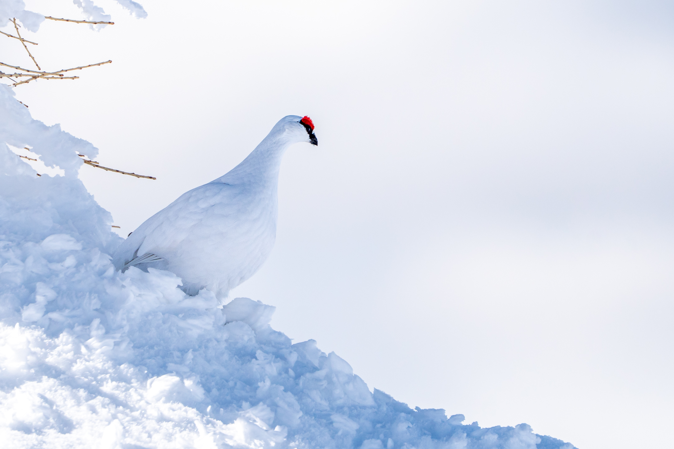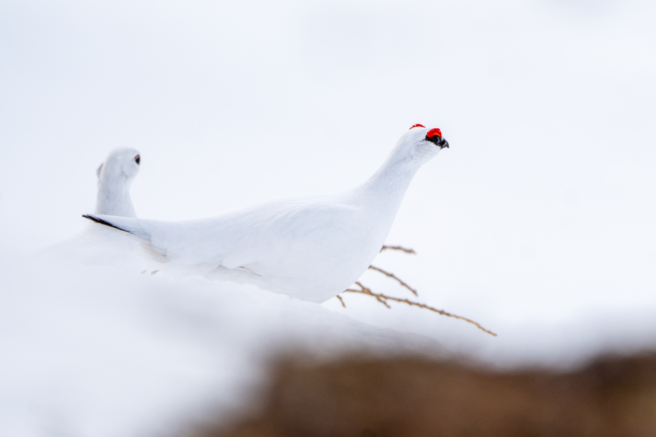 Also entschied ich mich, mich in den Schnee zu legen, und machte ein paar Aufnahmen des Schneehuhns unter der Lärche. Je nach Lichtsituation entstanden ganz unterschiedliche Fotos, wie die Serie oben anschaulich darstellt. Nach einer Weile kam neben dem Weibchen auch noch das Männchen hinter dem Hügel hervor. Im Gegensatz zum Weibchen besitzt es einen auffälligen roten Überaugenwulst.
