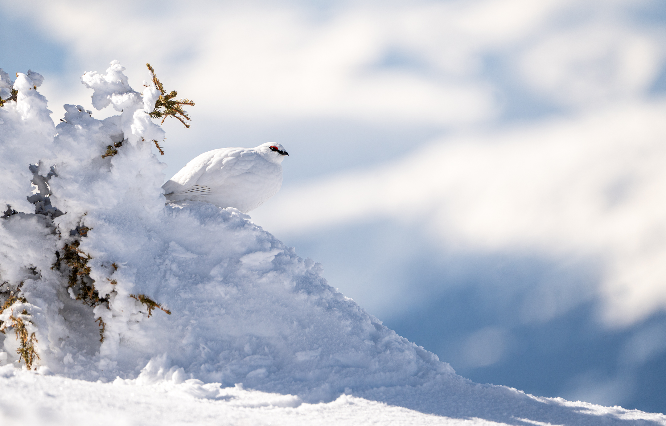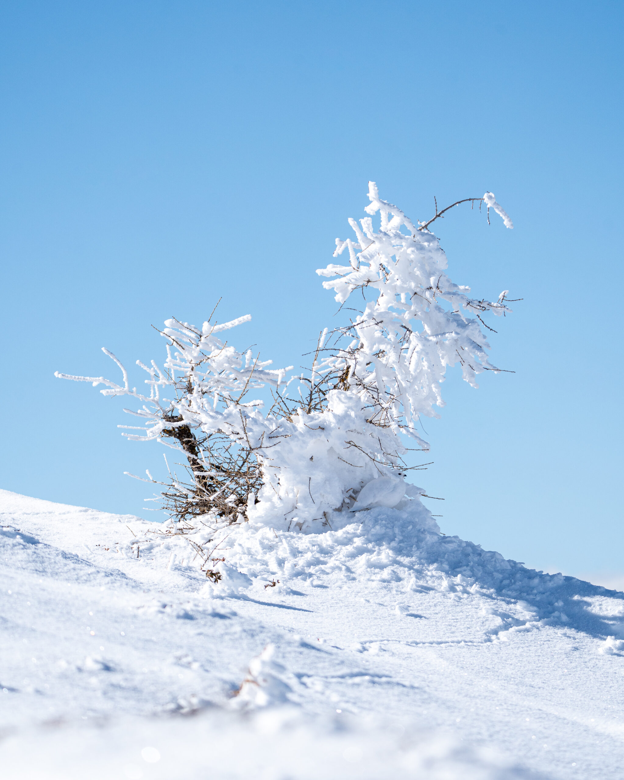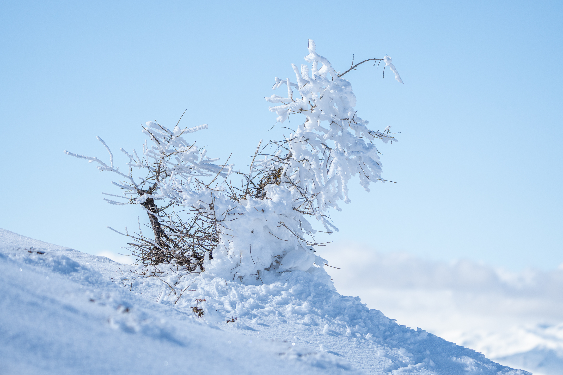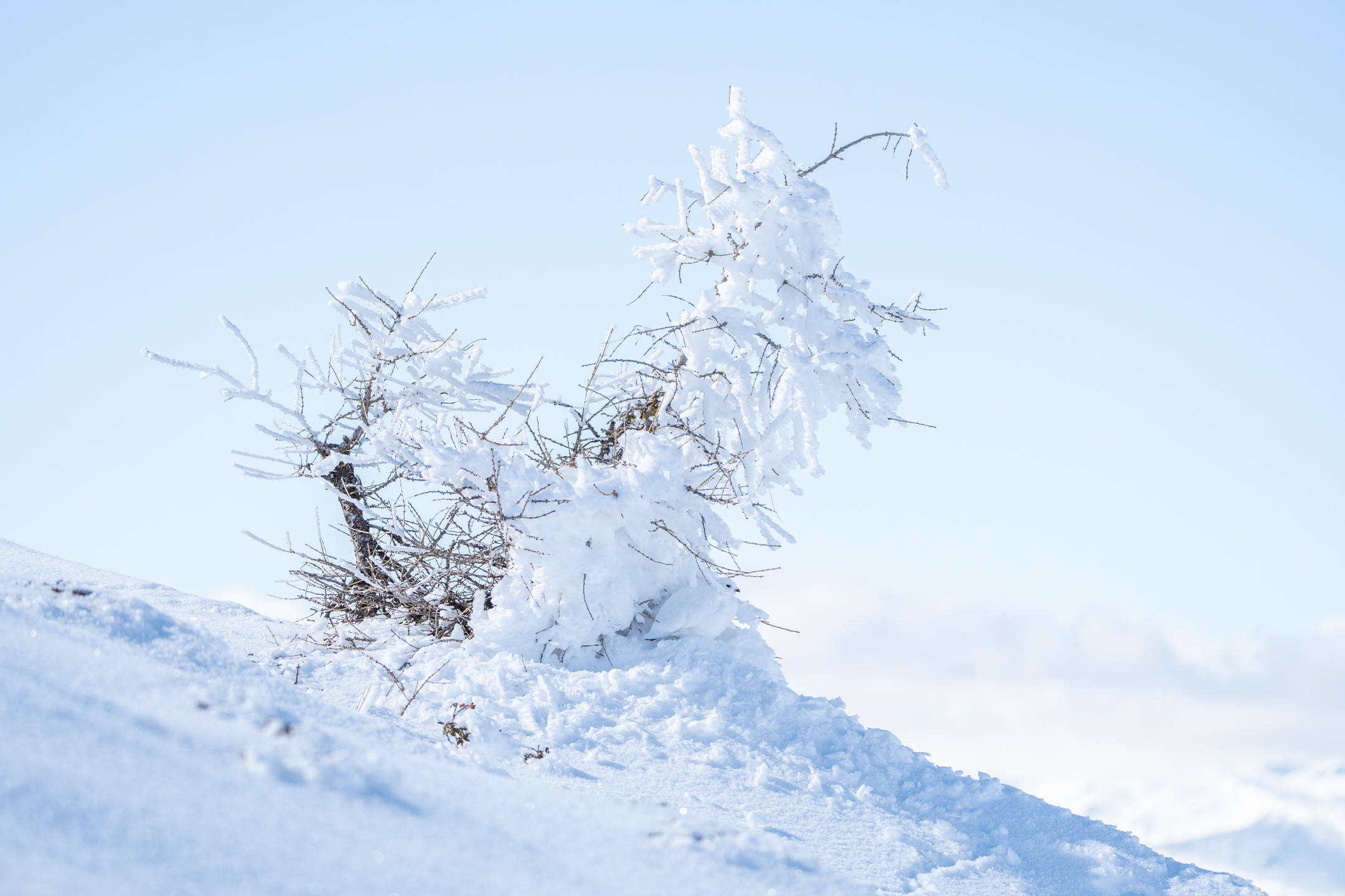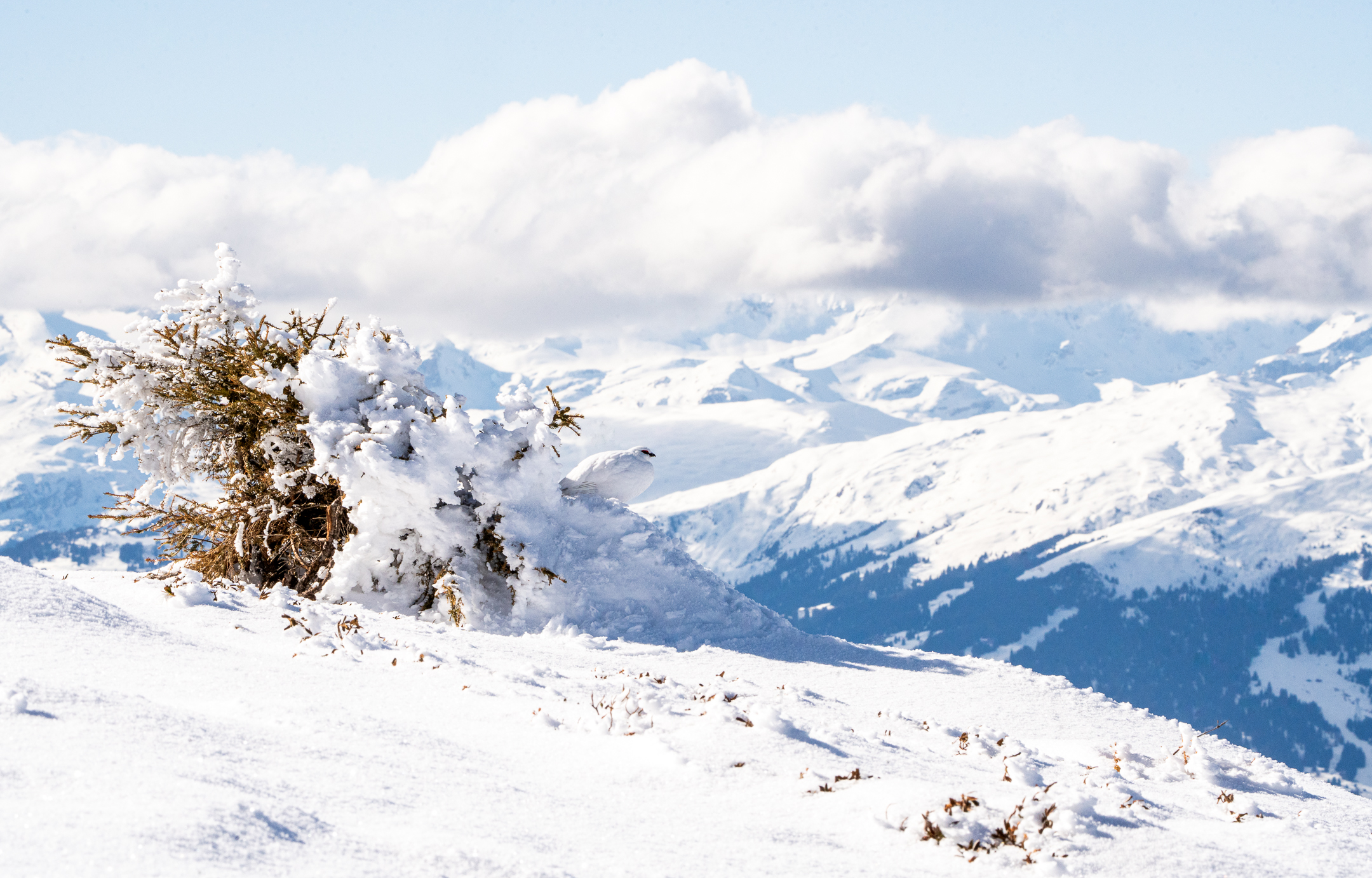 Schlussendlich zogen sich die Schneehühner wieder in ihr Versteck zurück. Diesmal liessen sie sich bei einem verschneiten Tännchen nieder.