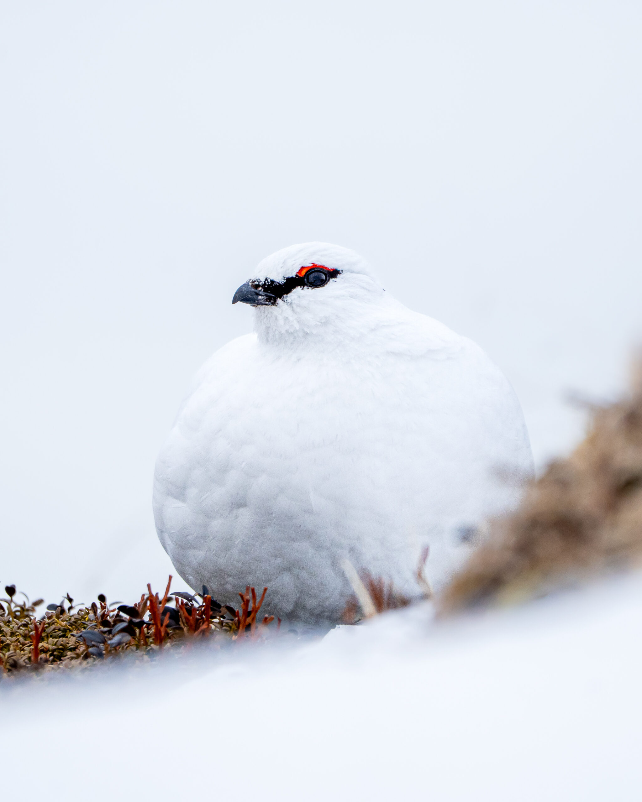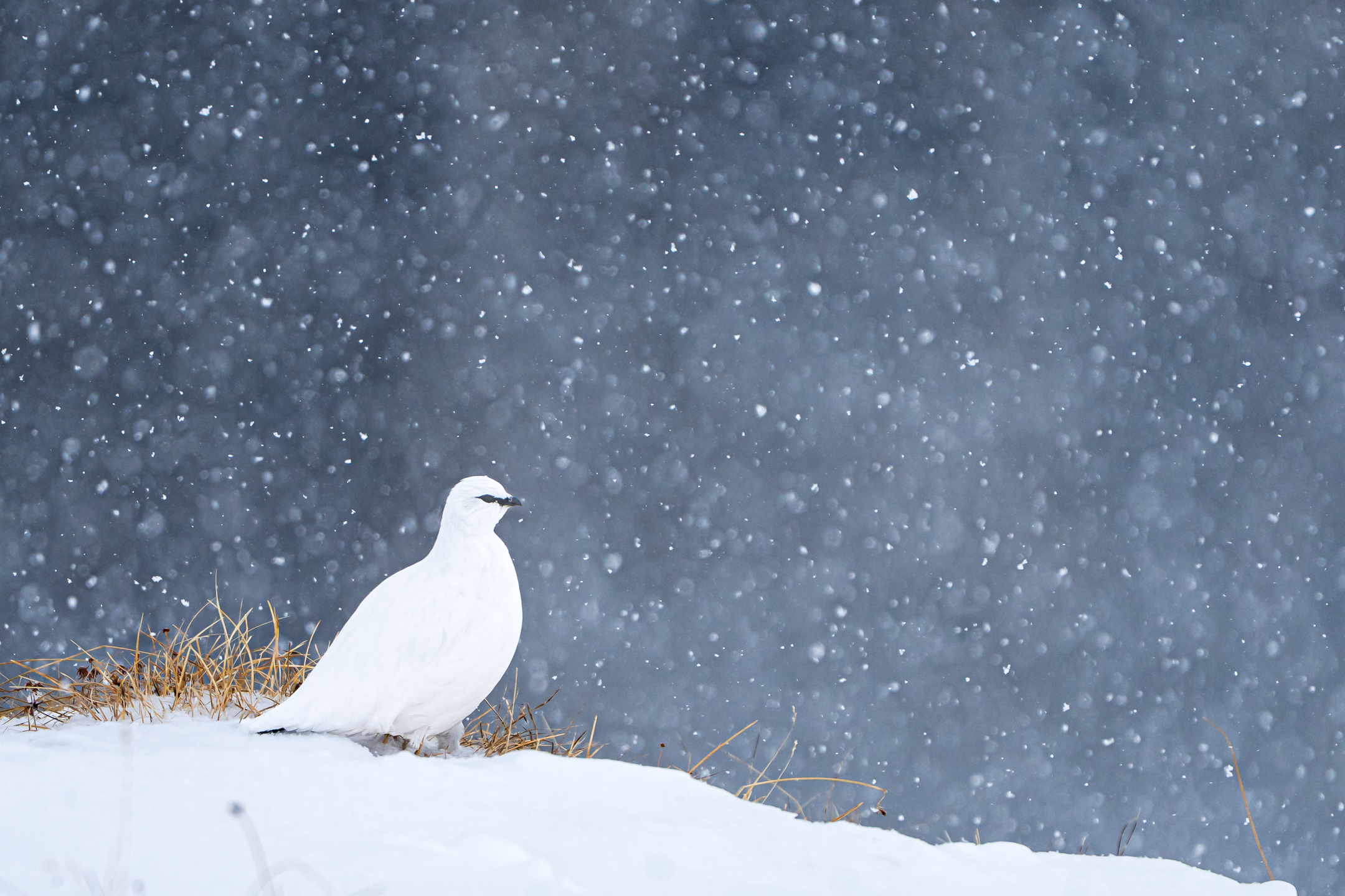 Völlig unerwartet entdeckte ich vor mir im Schneegestöber ein Schneehuhn. Glücklicherweise noch früh genug, sodass ich verhindern konnte, es direkt aufzuscheuchen. Damit hätte ich nie gerechnet, vor allem angesichts der extremen Wetterbedingungen. Dementsprechend wenig aktiv war das Schneehuhn auch und blieb an Ort und Stelle stehen, wo mir meine ersten Fotos im Schnee gelangen.
