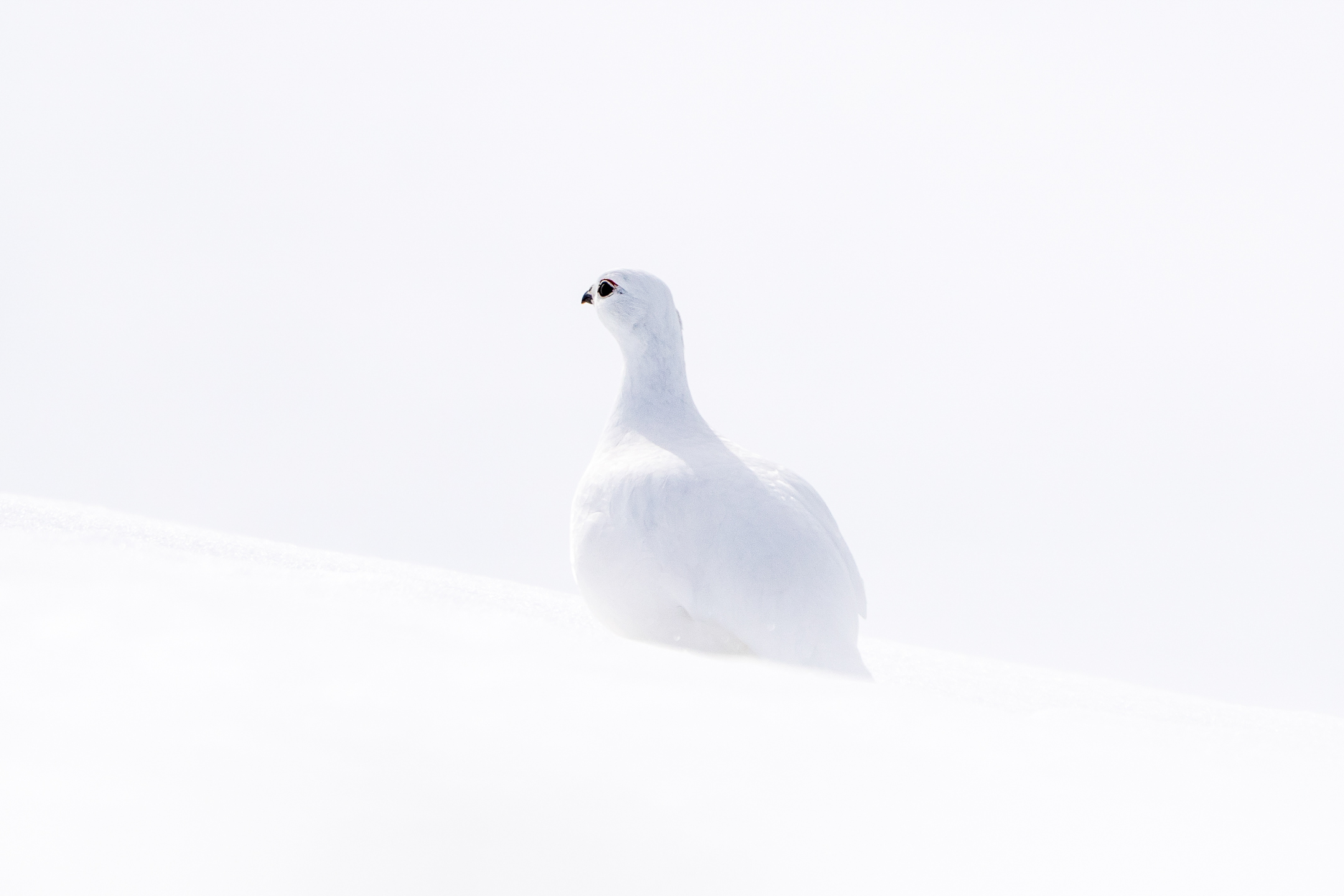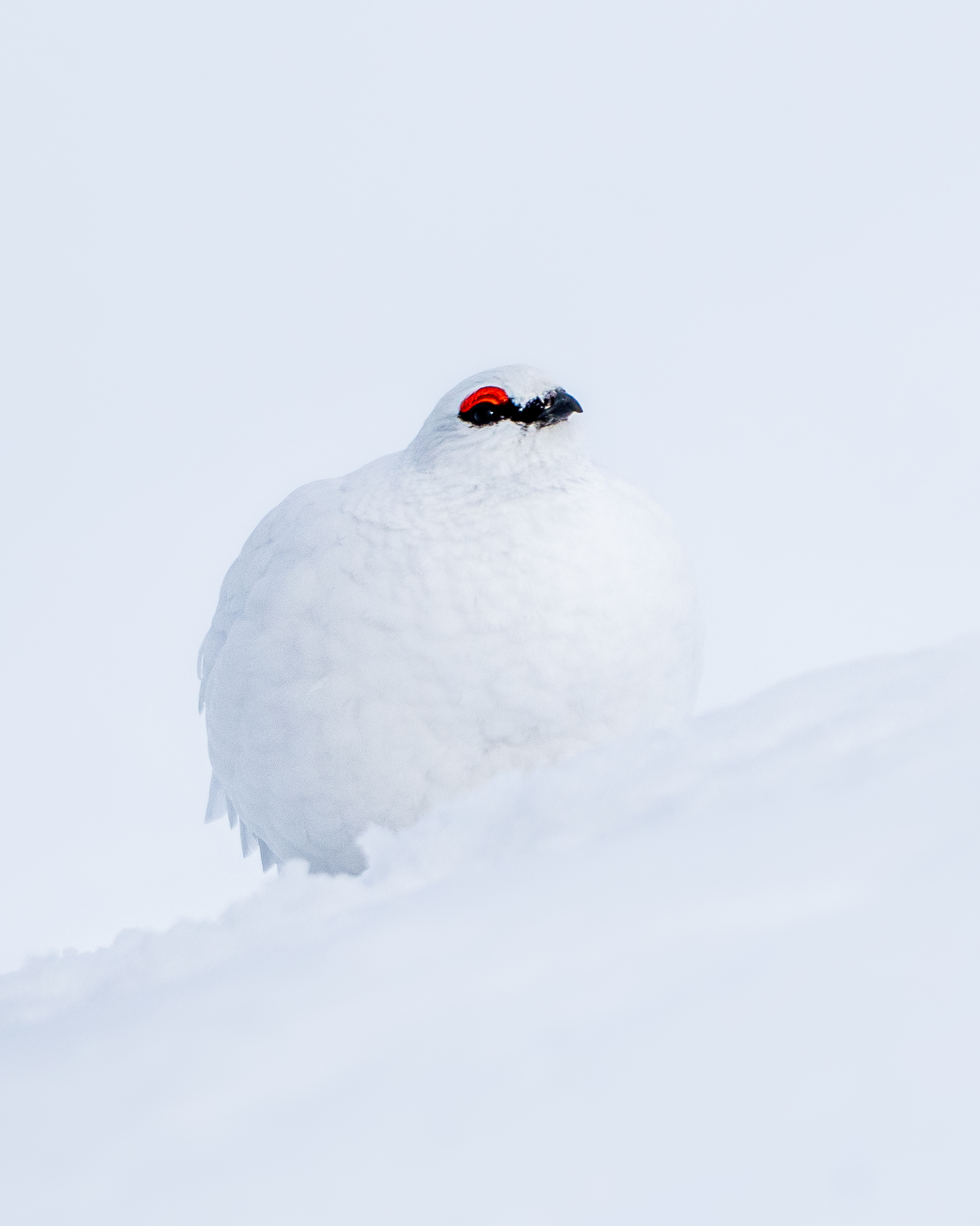 Nach einer Weile entschloss ich mich, mich ebenfalls in Richtung des Geländerückens zu begeben. Dort angekommen stand ich plötzlich wie aus dem Nichts Auge in Auge mit dem Männchen. Sein Kopf ragte gerade noch aus dem Schnee, und es entstand dieses minimalistische Bild.
