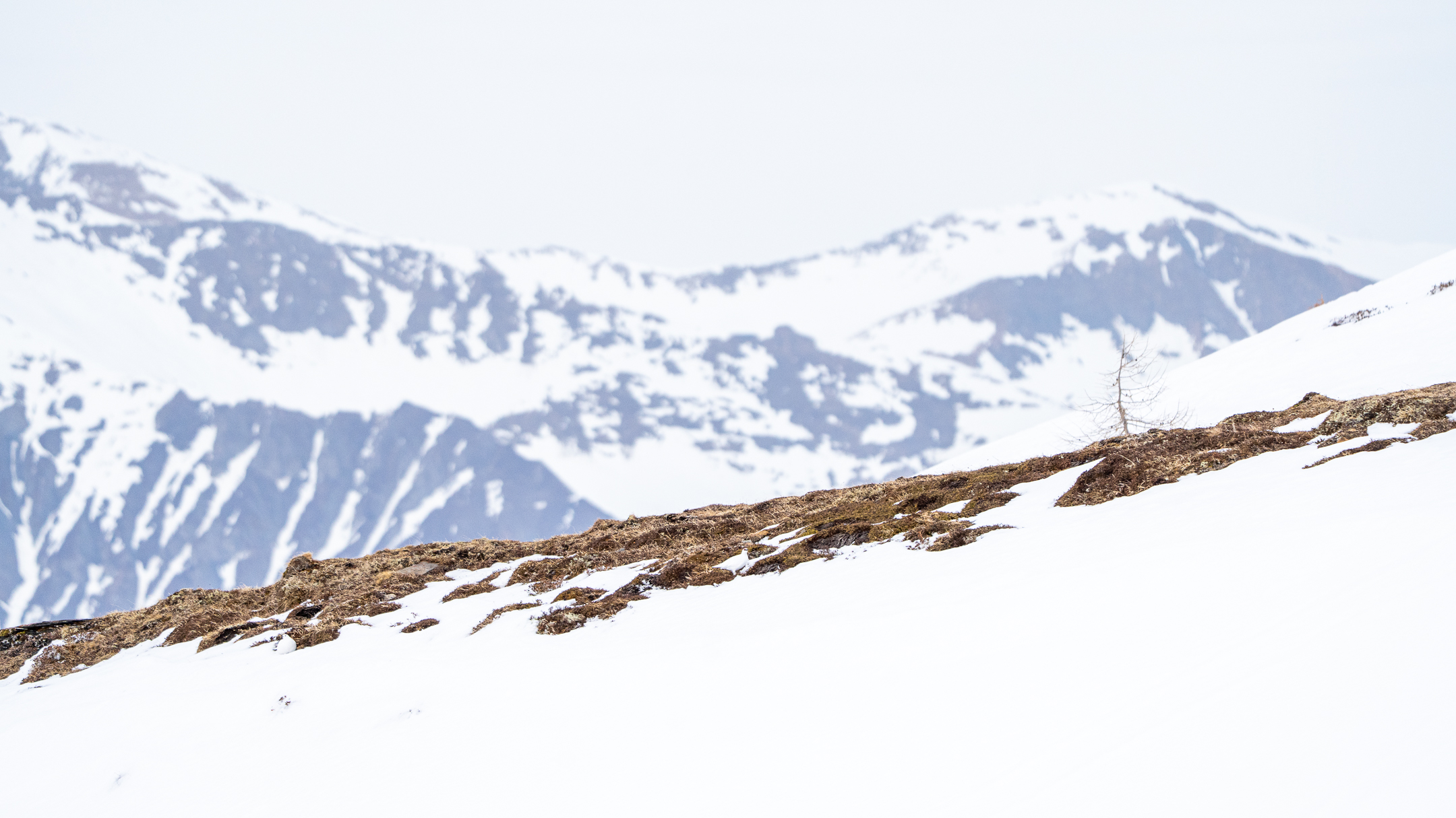 An einem weiteren Tag, diesmal nahe dem Winterende, war ich erneut auf der Suche nach den Schneehühnern. Dieses Mal war es jedoch nicht so sehr sonnig, das Licht war angenehm diffus. Oben auf dem Berg angekommen, begegnete ich gleich mehreren Wintersportlern, die Speedriding betrieben. Bei dieser Sportart fährt man mit Skiern den Hang hinunter und nutzt gleichzeitig einen kleinen Gleitschirm. Kreuz und quer waren ihre Spuren im Schnee zu sehen, und irgendwie taten mir die Schneehühner leid. Kurz hatte ich Bedenken, weil die Sportler sie möglicherweise weit vertrieben haben könnten.